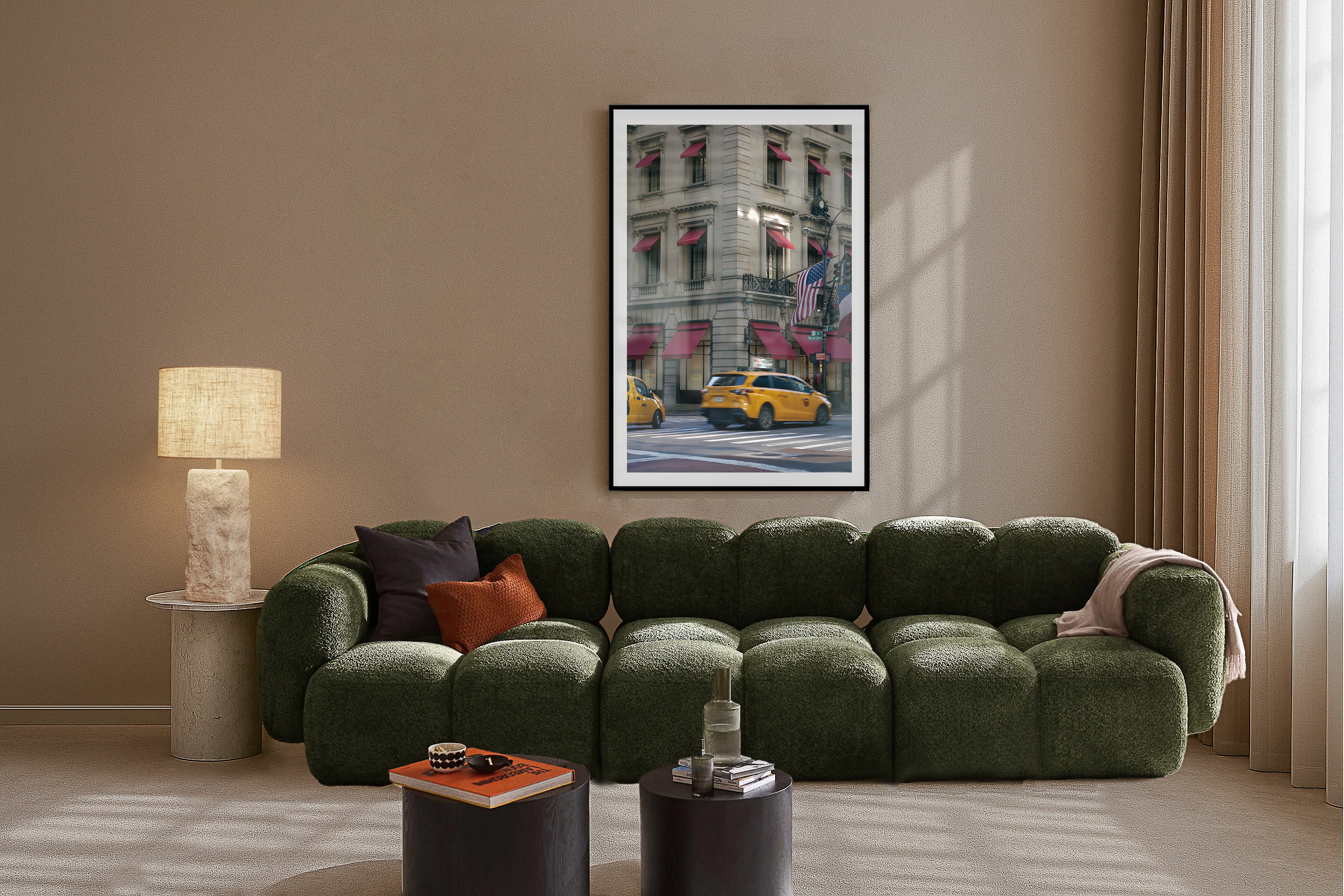 This image captures Place de Cartier as a quiet emblem of New York elegance woven into the city’s restless flow. The pale stone façade, punctuated by deep red awnings, feels both refined and theatrical, standing firm at the corner like a jewel box opened to the street. Yellow taxis blur past in the foreground, their motion contrasting with the building’s timeless stillness, while the American flag hangs in soft defiance of gravity and speed. The intersection becomes a meeting point of luxury and urgency, heritage and movement. In this moment, New York reveals its signature tension, where tradition holds its ground amid the perpetual rush of the present.