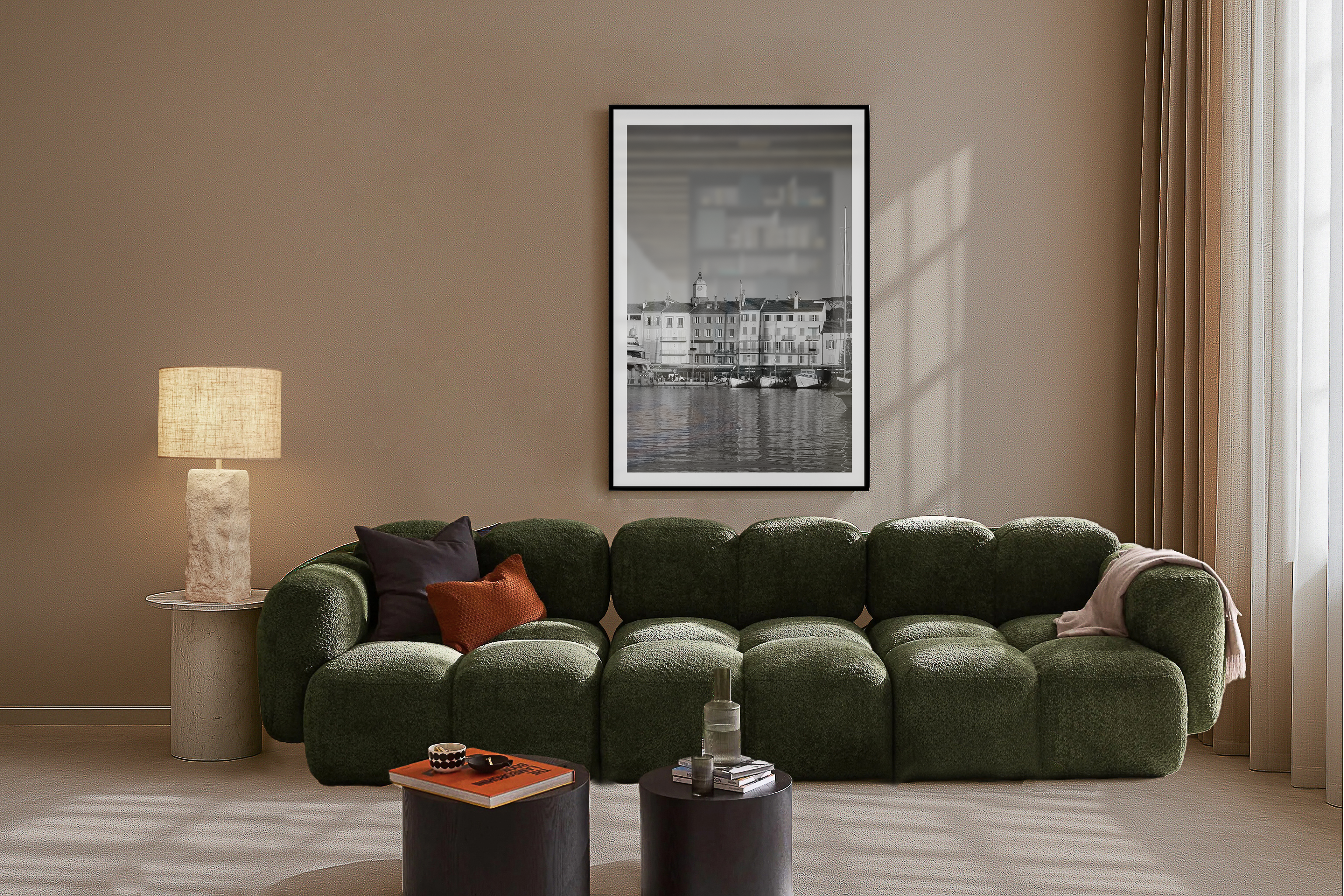 The black-and-white photograph of Saint-Tropez captures the serene charm of this famous coastal town. The image showcases a row of traditional French buildings, their facades gracefully reflecting in the calm waters of the harbor. The architecture, with its varying heights and textures, speaks of the town's rich history and Mediterranean allure. Above the rooftops, the distinctive clock tower stands as a silent sentinel, marking the passage of time with an air of timeless elegance. The lack of color in the photograph enhances the play of light and shadow, adding a nostalgic, almost timeless quality to the scene. The boats moored in the foreground hint at the town's vibrant maritime culture, while the still water mirrors the peaceful atmosphere. This evocative image beautifully encapsulates the essence of Saint-Tropez, blending its historical significance with its tranquil seaside beauty.