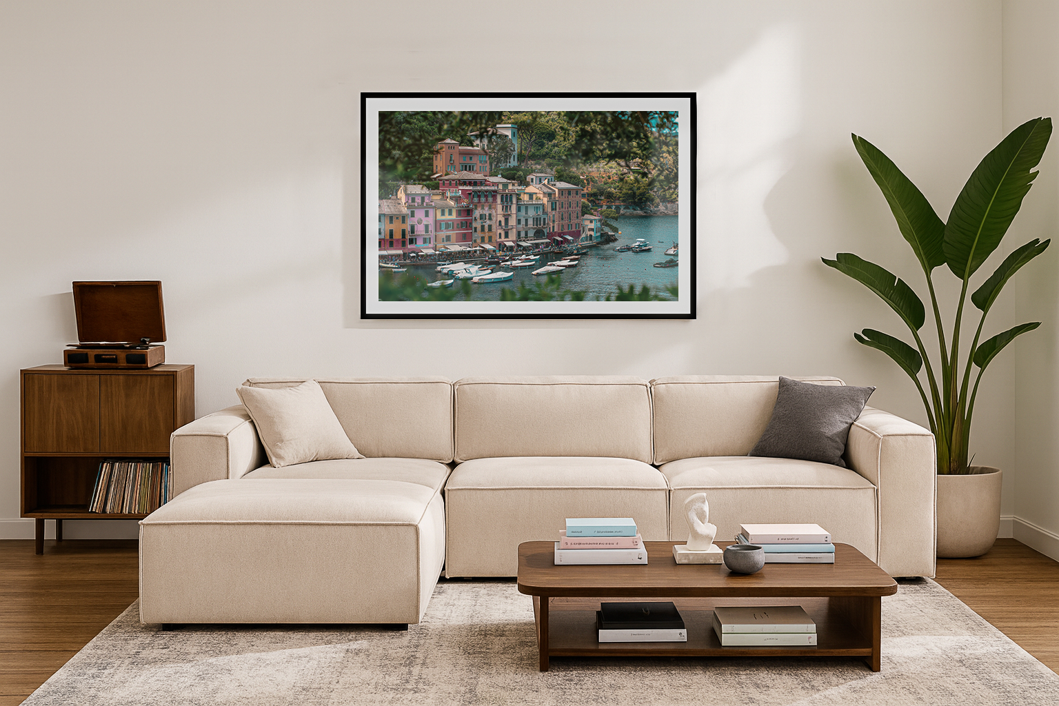 In this enchanting scene, the vibrant village of Portofino emerges through the delicate branches of a tree, creating a picturesque frame that highlights its charm. The colorful facades of the buildings—each painted in cheerful hues of coral, lemon yellow, and soft blue—burst with life, their reflections shimmering on the tranquil waters of the harbor. The gentle sway of the tree adds a sense of movement to the image, enhancing the feeling of being enveloped in this idyllic coastal haven. This composition beautifully captures the harmonious blend of nature and architecture, inviting viewers to lose themselves in the vibrant essence of Portofino, where every corner reveals a story waiting to be discovered.