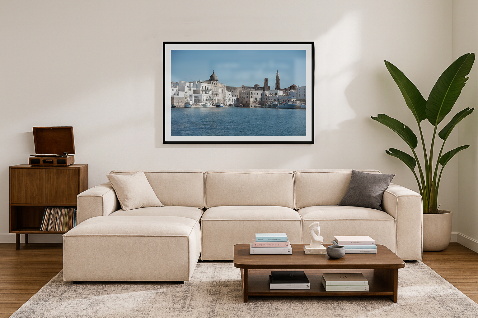 The port of Monopoli unfolds like a picturesque canvas, where the vibrant colors of fishing boats contrast beautifully against the deep blue of the Adriatic Sea. Each vessel, with its rustic charm, sways gently in the harbor, their hulls painted in a patchwork of reds, greens, and whites that reflect the town's maritime spirit. The ancient stone walls of the port cradle this lively scene, their weathered surfaces telling tales of countless sailors and traders. Seagulls glide above, adding a sense of movement to the serene landscape, while fishermen prepare their nets, embodying the timeless rhythm of life in this enchanting Italian coastal gem. This harmonious blend of color, history, and maritime culture invites viewers to immerse themselves in the tranquil beauty of Monopoli.