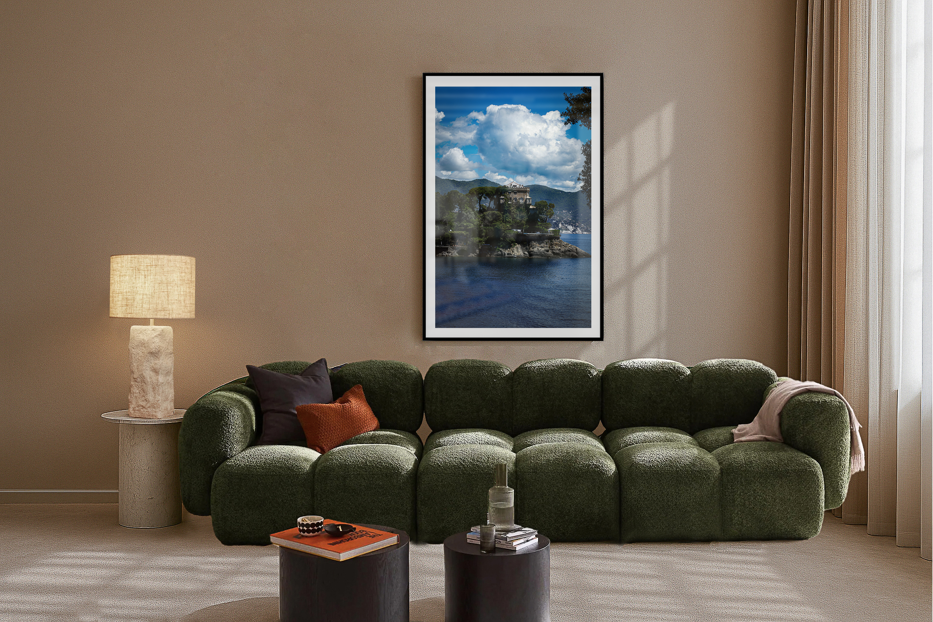 Perched gracefully above the shimmering azure waters of Portofino, a classic villa commands attention, its timeless architecture harmonizing beautifully with the rugged cliffs that cradle it. The villa’s elegant façade spills over with a riot of color against the backdrop of the deep blue sea. Sunlight glistens on the water's surface, creating a sparkling pathway that draws the eye toward the horizon. Lush greenery frames the villa, enhancing its idyllic setting while adding a sense of tranquility to the scene. This picturesque view encapsulates the charm of the Italian Riviera, inviting viewers to imagine the gentle sound of waves lapping at the shore and the soft whisper of a Mediterranean breeze, evoking a dreamlike escape to this enchanting coastal paradise.