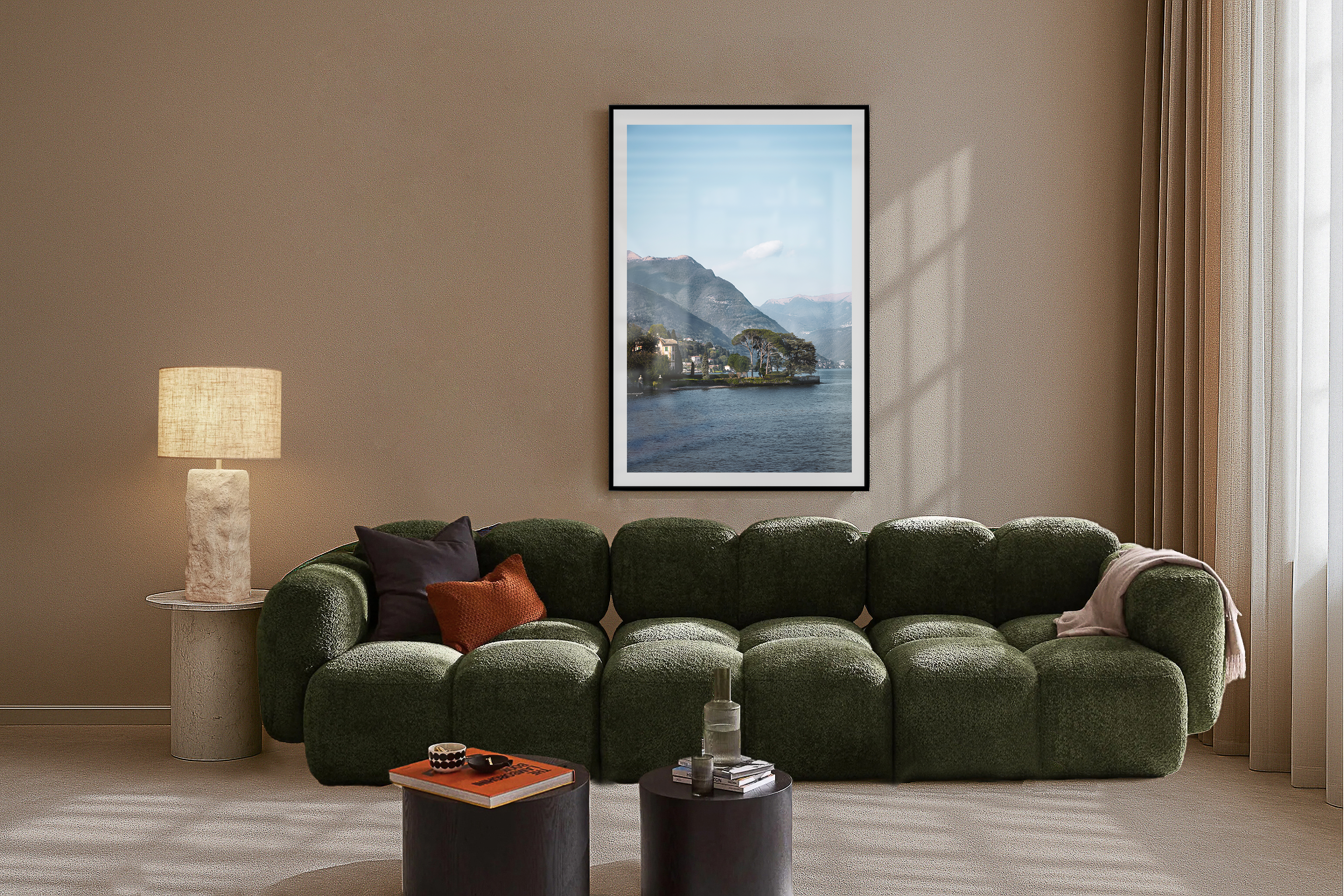 The serene expanse of Lake Como unfolds in a breathtaking panorama, framed by lush green hills that rise majestically from its shores. The water, a deep sapphire blue, reflects the sky’s shifting hues, creating a mesmerizing interplay of light and color. Verdant terraces cascade down the slopes, dotted with vibrant wildflowers and charming villas that seamlessly blend into the natural landscape. The gentle curves of the hills create a sense of rhythm, inviting the eye to wander along their contours, while the distant peaks loom softly in the background, shrouded in a delicate mist. This idyllic scene captures the essence of tranquility and beauty, where nature and human life exist in perfect harmony, inviting viewers to immerse themselves in the serene allure of this enchanting Italian paradise.