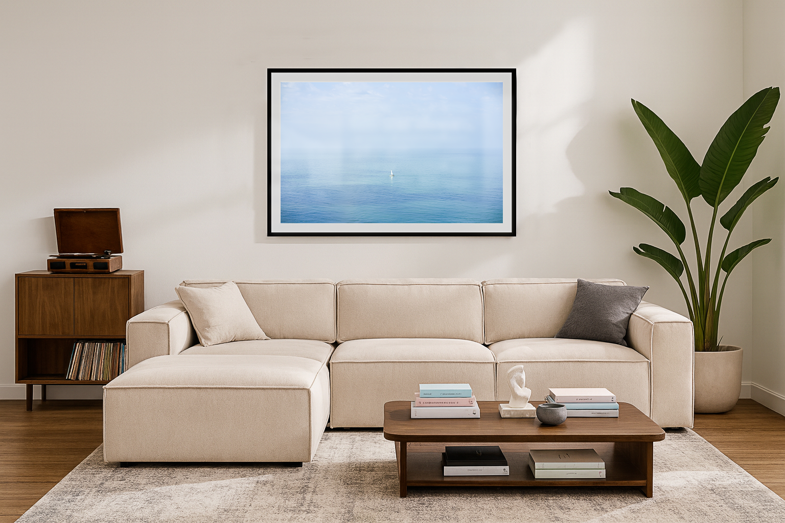 Suspended in a sea of infinite blues, this photograph taken off the coast of Étretat distills serenity into its purest form. A lone sailboat glides silently through the vastness, dwarfed by the boundless horizon that merges water and sky into a seamless gradient. The image evokes both calm and introspection — a minimalist composition where the emptiness becomes a meditation. Light plays gently on the water’s surface, casting subtle shadows and reflections, turning the ocean into a soft, textured canvas. Here, the absence of land or detail invites the viewer to drift into the abstract — to lose oneself in the quiet majesty of stillness.