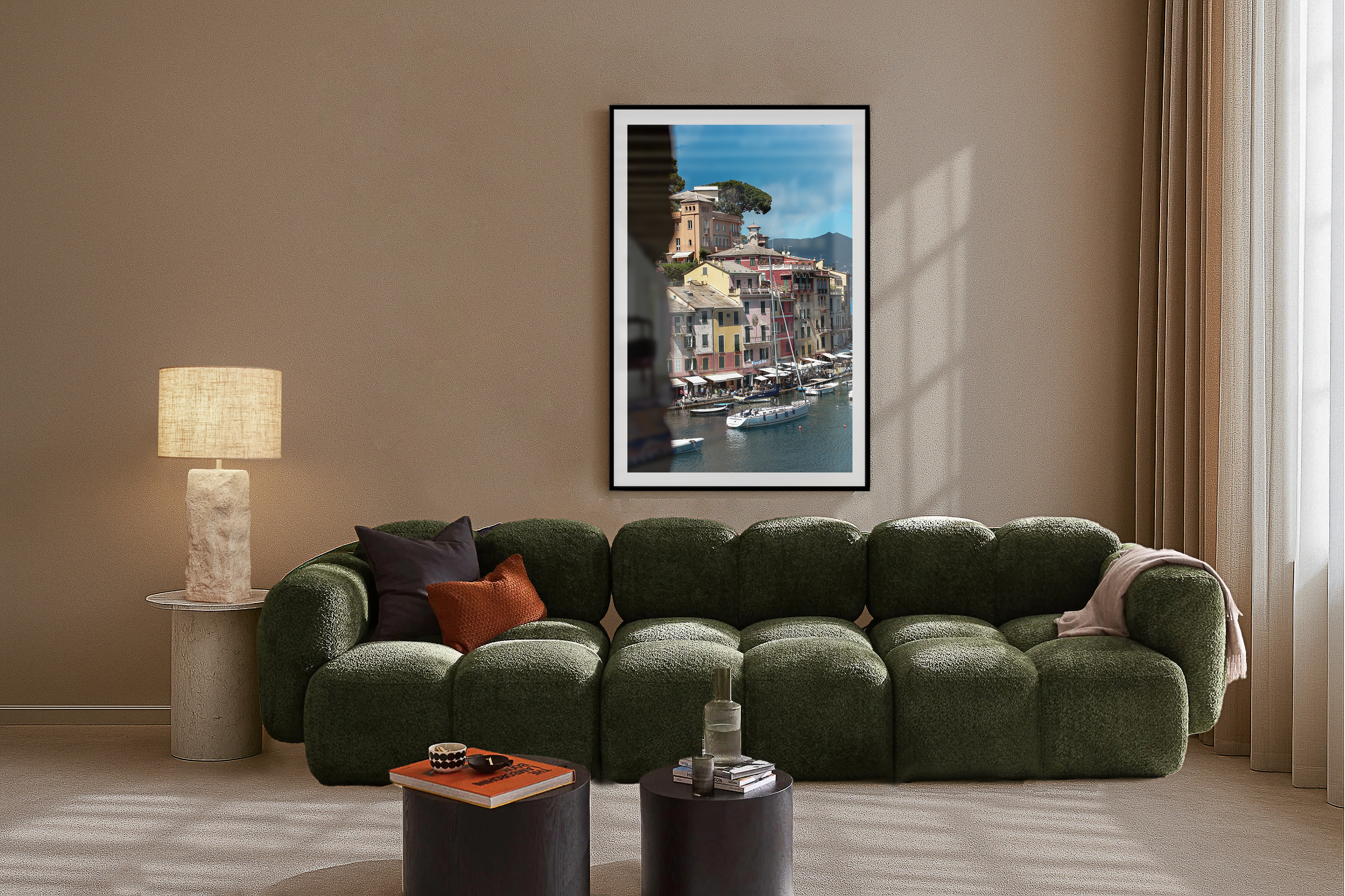This stunning photograph of Portofino captures the essence of the Italian Riviera, blending vibrant colors, elegant architecture, and serene coastal beauty. The pastel-hued facades of the buildings, reflected in the shimmering turquoise waters, create a striking contrast with the deep blue sky and lush greenery. A sailboat gently floating in the harbor adds a sense of movement and tranquility, inviting the viewer into this picturesque Mediterranean scene. The interplay of light and shadow, combined with the rich textures of the waterfront, transforms this photograph into a visual celebration of Portofino’s timeless charm and elegance.
